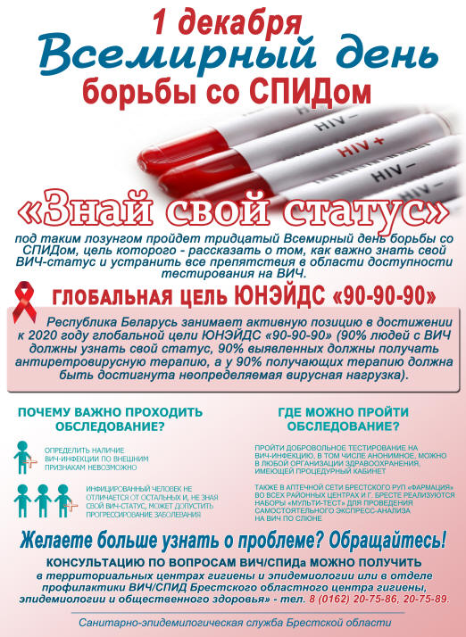 Брестская область занимает активную позицию в достижении к окончанию 2020 года глобальной цели ООН «90-90-90» (90% людей с ВИЧ должны знать свой статус, 90% выявленных должны получать антиретровирусную терапию, а у 90% получающих терапию должна быть достигнута неопределяемая вирусная нагрузка). Мы стремимся к достижению данных показателей и на 01.11.2020 года в Брестской области выявлено 80,4% лиц, живущих с ВИЧ от оценочного числа, рассчитанного компьютерной программой «СПЕКТРУМ» (2100 человек), 84,7% лиц, живущих с ВИЧ, получает лечение (1430 чел.). 88,0% лиц, получающих лечение, имеют неопределяемую вирусную нагрузку (1259 чел.). По охвату лечением и показателю неопределяемой вирусной нагрузки Брестская область занимает первое место в республике.