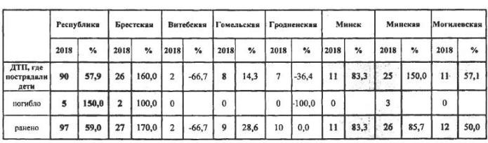 Число ДТП с участием детей, погибших и раненых возросло в Брестской (с 10 до 26; с 1 до 2 и с 10 до 27) и Минской (с 10 до 25; с 0 до 3 и с 14 до 26) областях. Наряду с этим в Могилевской, Гомельской областях и г. Минске возросло количество таких происшествий (с 7 до 11,с 7 до 8 и с 6 до 11 соответственно) и раненых в них детей (с 8 до 12, с 7 до 9 и с 6 до 11 соответственно).