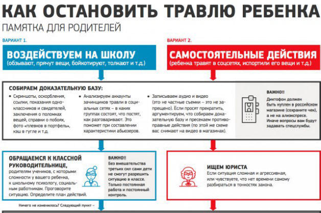 Травить ребенка могут психологически (включая обе крайности – как шквал оскорблений, так и бойкот), физически (поджидать в подворотне и бить), прятать, портить и воровать его вещи. Способов нарушить границы личности множество. В таком случае следует сообщить классному руководителю и руководству учреждения образования. Также для защиты интересов ребенка можно обратиться в соответствующий орган опеки и попечительства. При возможности стоит поговорить с законными представителями обидчика. Если необходимо, рекомендуется обратиться к детскому психологу.