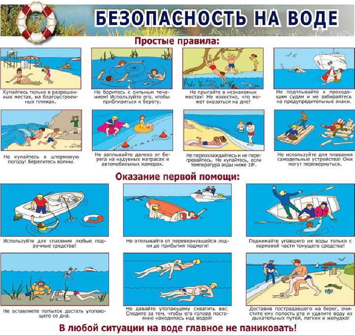 1. Купайтесь только в специально отведенных местах, на оборудованных пляжах, где в случае беды вам помогут спасатели. В непроверенном водоеме могут быть водовороты, глубокие ямы, густые водоросли, холодные ключи, коряги, сильное течение, захламленное дно, что может привести к травме, а ныряние - к гибели.