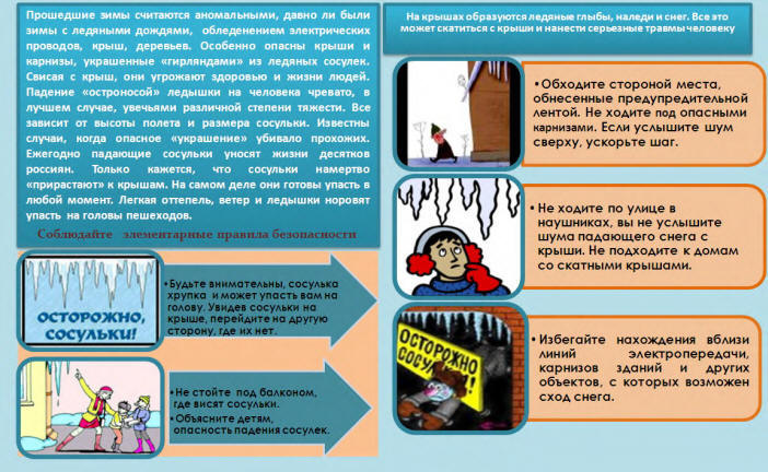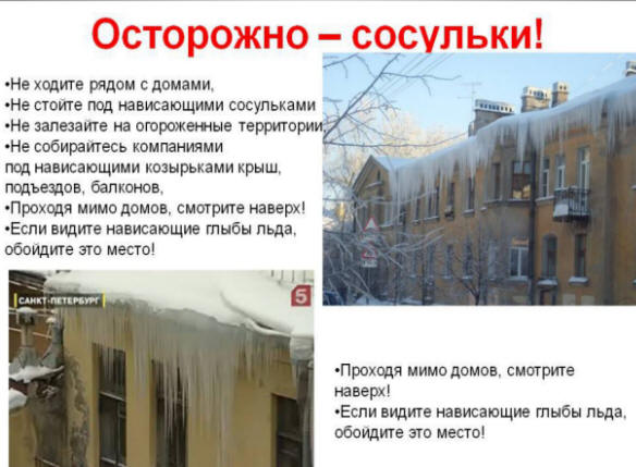 Ранней весной или во время оттепели зимой старайтесь двигаться на расстоянии от домов и строений. Реальную опасность представляют сосульки и падающие с крыш куски льда. Предельно осторожным нужно быть зимой и весной во время снежной бури, метели, сильного ветра, так как при этом могут быть сорваны листы железа с парапетов и крыш домов, уличные фонари, большие ветки старых деревьев.
