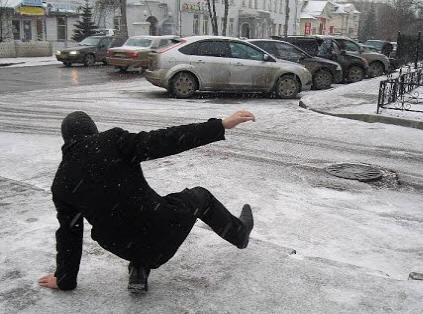 2) обращать внимание на свою походку на скользкой улице. Ступать нужно на всю подошву, не торопиться, ноги слегка расслабить в коленях. На подошву обуви приклеить полоски (поперек) из плотной ткани с помощью клея "Момент" или обувного (специального) клея. Руки при ходьбе должны быть свободными. Если падение неизбежно, нужно присесть и сгруппироваться. Это позволит не удариться головой.