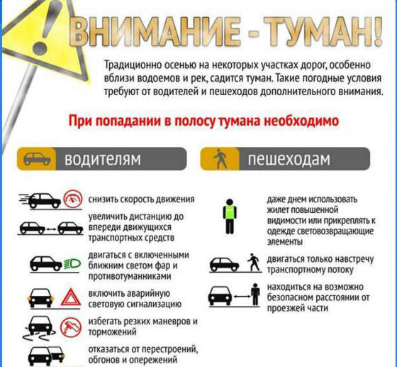 Важно учитывать, что туман скрадывает расстояние – целесообразно увеличить обычную дистанцию.